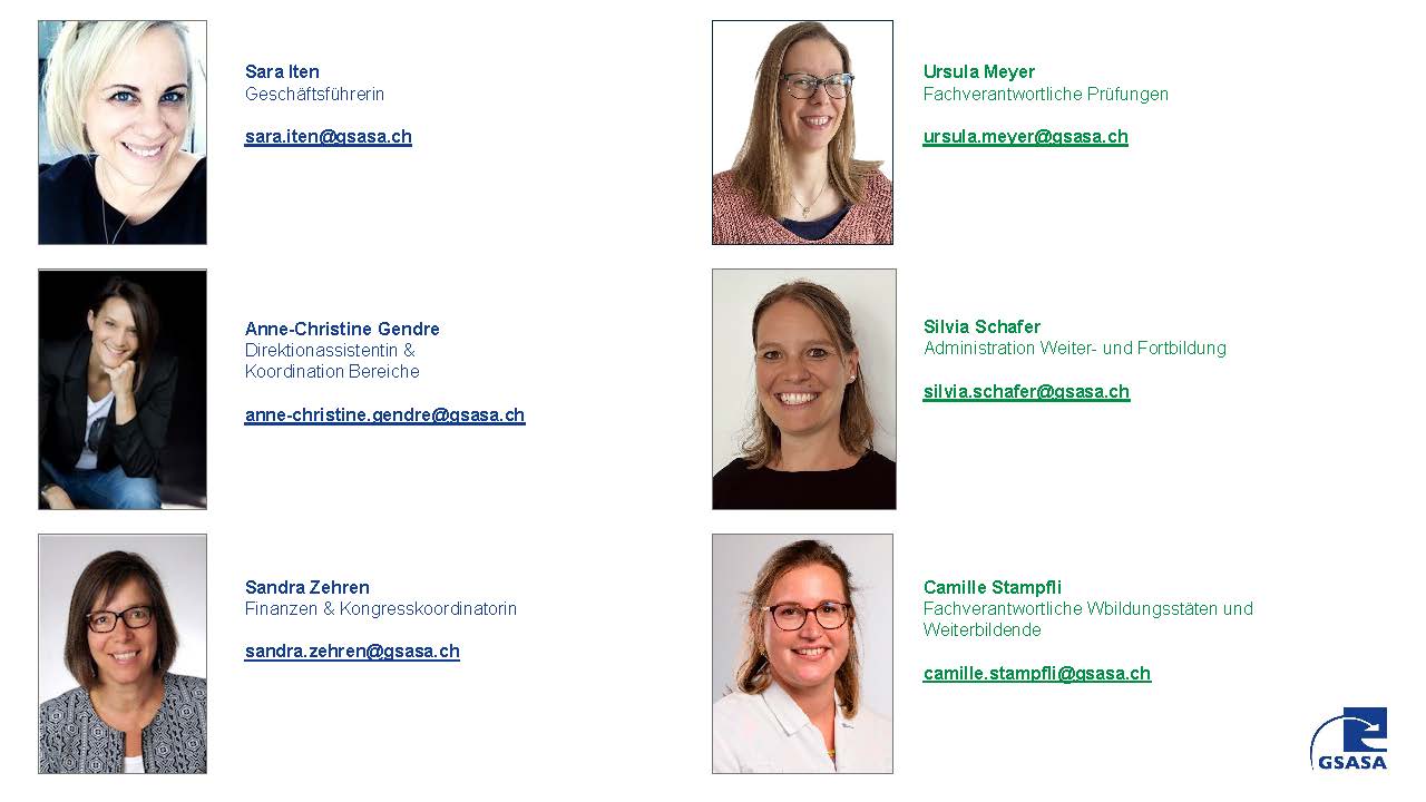 Die Geschäftsstelle kümmert sich um Fragen von Mitgliedern, das Mitgliederwesen (Eintrittsgesuche, Austritte etc.) die GSASA interne Kommunikation und das Rechnungswesen. Sie steht im engen Kontakt mit dem Vorstand, der Kommission für Weiter- und Fortbildung (FPH Spital) sowie anderen Fach- und Interessengruppen.